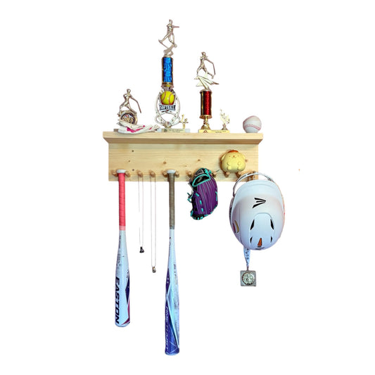 YEEYAYA Handmade Wall-Mounted Softball/Baseball Storage Rack – 2 Tiers, Holds 11 Bats, 6 Balls, Trophy Display Shelf with Groove for Picture Frames, Supports up to 30 lbs Baseball Softball Bat Holder